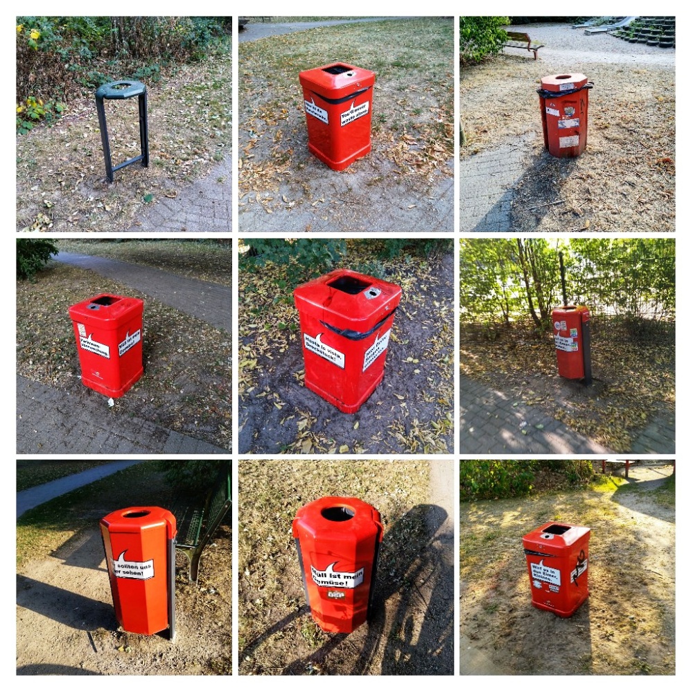 Hier eine Auswahl der Mülleimer, die es auf den nur 500 Meter Weg zur Kita gibt. Es sind eigentlich 16 Stück, aber dann sieht die Collage doof aus und die meisten sind neu (neu sind die mit wenigen oder keinen Aufklebern).